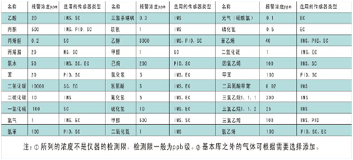 备注:报警浓度数值为消防员不带呼吸保护罩时只可以工作4小时的气体浓度